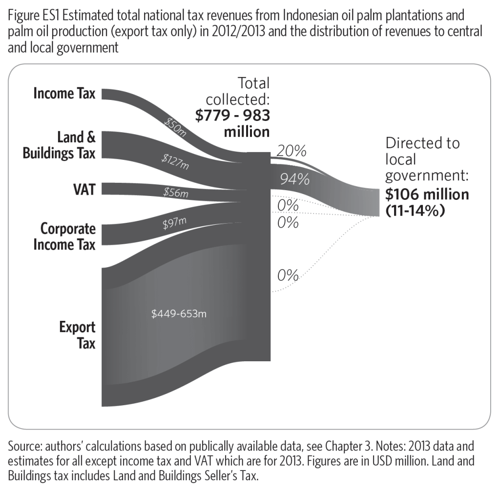 Dalam studi kasus yang menyoroti perpajakan sektor minyak sawit, Climate Policy Initiative (CPI) menemukan bahwa industri ini menyumbang sedikitnya Rp10 triliun terhadap penerimaan pajak nasional pada 2012/2013. Meski demikian, rasio pajak terhadap PDB di sektor ini relatif rendah, sekitar 3,4%, sehingga menunjukkan adanya peluang untuk meningkatkan penerimaan pajak. Studi tersebut juga memperkirakan bahwa hanya 11–14% (Rp1.103 miliar) dari pendapatan minyak sawit yang dialokasikan langsung kepada pemerintah daerah pada periode yang sama, menandakan adanya potensi untuk memperbesar serta mengarahkan dana bagi hasil, dengan tetap mempertimbangkan kondisi fiskal secara keseluruhan.